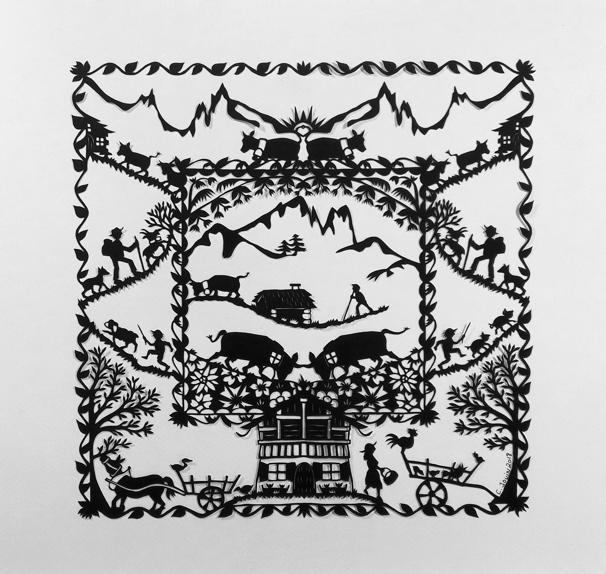 Made in the valleyAvant, Corinne Jouin faisait de la pub. Des logos, des maquettes, du stress. Elle a tout plaqué pour répondre à l’appel de la montagne. Au hasard d’une rando, elle découvre l’art du papier découpé, tradition suisse venue du folklore de la Gruyère et de Saanen. C’est Sophie Crawford, découpeuse prodige qui expose à l’hôtel Albert 1er, qui lui transmet ses gestes et sa précision millimétrée pour dompter les feuilles et jouer du scalpel. Un art humble et patient où chaque silhouette raconte une histoire et chaque trou dans le papier est une respiration, voire une méditation.