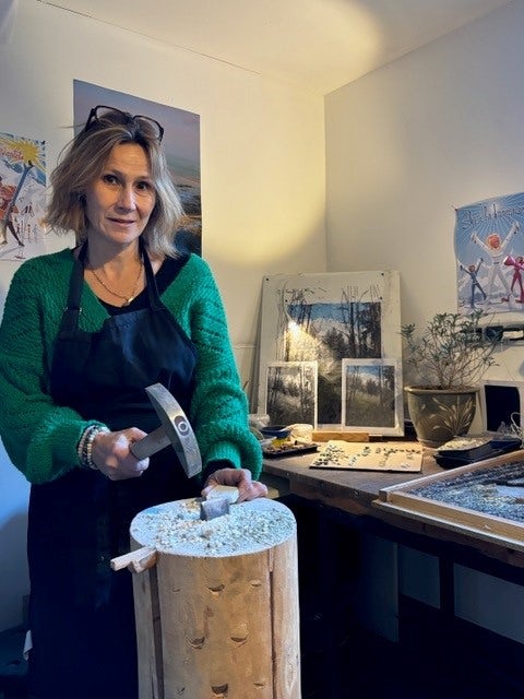 Autodidacte perfectionniste, Sonia Saguez-Bozon est allée apprendre les gestes ancestraux de sa discipline auprès des mosaïstes d’art de la ville de Ravenne et de l’école Spilimbergo en Italie. Dans son atelier, elle assemble des ardoises récoltées au détour d’une rando, des éclats de cristaux trouvés sur un sentier, des petits morceaux de montagne qui vibrent encore du froid d’altitude. Elle compose des tableaux bruts, minéraux et sensibles qui racontent la Vallée aussi bien qu’un guide de haute montagne.