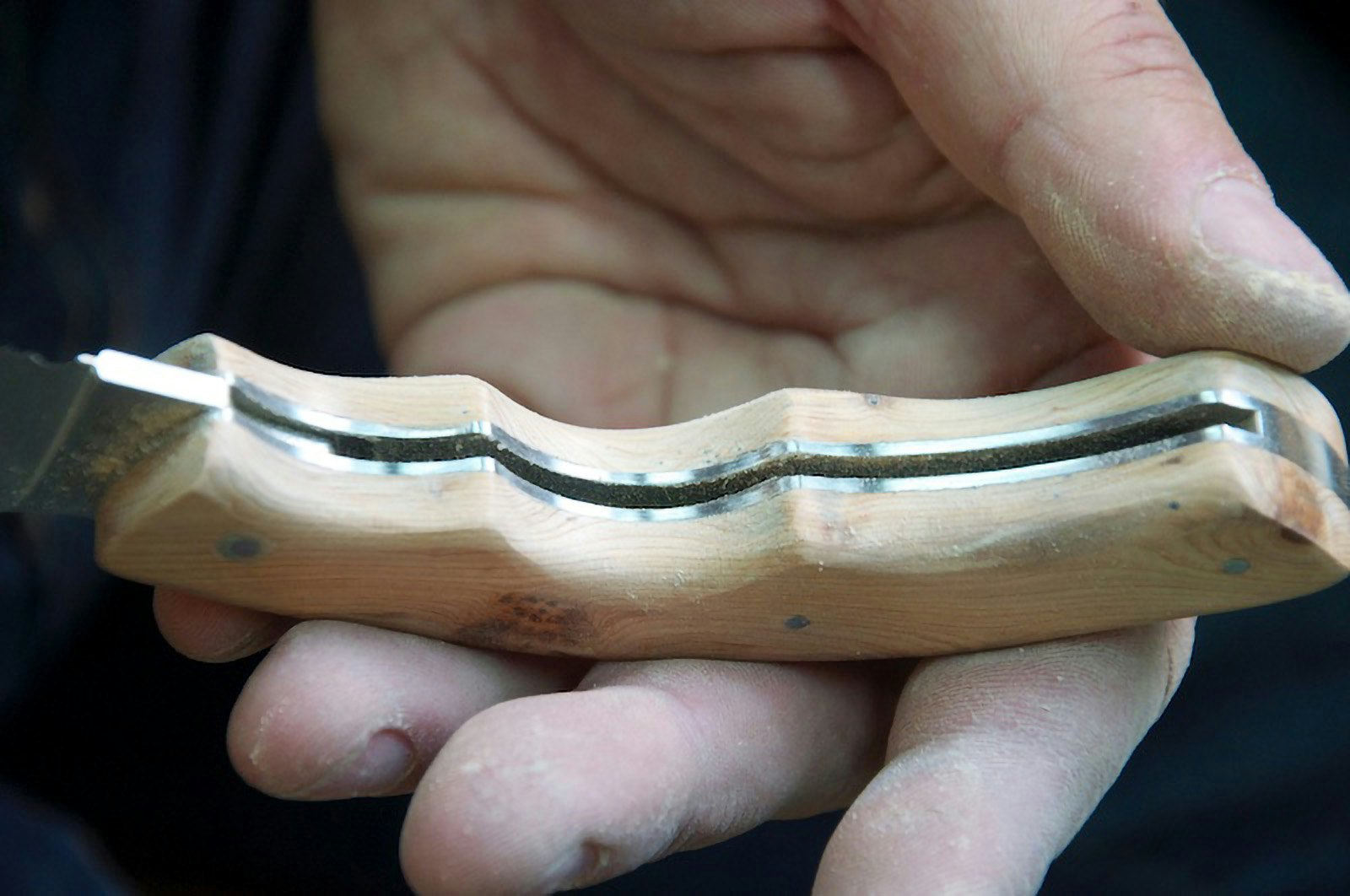 Didier Simond, c’est le genre de gars qui change de lame selon la saison : moniteur de ski l’hiver, coutelier l’été. L’atelier de cet ancien menuisier se trouve à Chamonix, et c’est dans la montagne qu’il va faire une partie de son marché. Il y déniche une essence rare, l’arolle, ce pin cembro qu’on trouvait il y a 3 000 ans à la place de la Mer de Glace. En fouillant la moraine, il exhume des troncs fossilisés pris dans le glacier, qu’il transforme en manches de couteaux. Des couteaux faits de bois millénaire. Uniques au monde. Didier et son fils travaillent aussi le mélèze de Vallorcine, le noyer de Servoz, du bouleau gelé de Chamonix… Leur signature : un manche bombé comme le mont Blanc, pyrogravé du tracé de la première ascension du sommet par Jacques Balmat et le Dr Paccard en 1786. Un geste fort, entre hommage et empreinte éternelle.